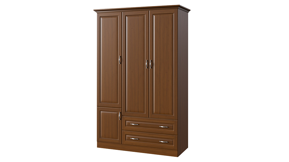 Классический шкаф, созданный в едином стиле с коллекцией Эдем — изделие без которого не возможно себе представить спальню. Корпус шкафа может быть изготовлен как из массива бука и ясеня, так и из массива мягколиственных пород, что делает его стоимость еще более демократичной. Трех створчатый шкаф имеет 3 базовые комплектации: c антресольной секцией в верхней (3-3) или нижней части (3-1) шкафа, или двумя выкатными ящиками (3-2) в нижней части шкафа. Стандартно двух створчатая секция шкафа располагается в правой части шкафа. Фасады шкафа могут иметь встроенные зеркала, как на лицевой части фасада — по размеру филенчатой части, так и на внутренней стороне фасада. Распашные дверцы шкафа оснащены петлями с системой до-закрытия в базовой комплектации. В большей секции шкафа предусмотрена штанга для плечиков, а в малой секции предусмотрены 3 полки для хранения вещей. По желанию шкаф может быть оснащен любым количеством полок.