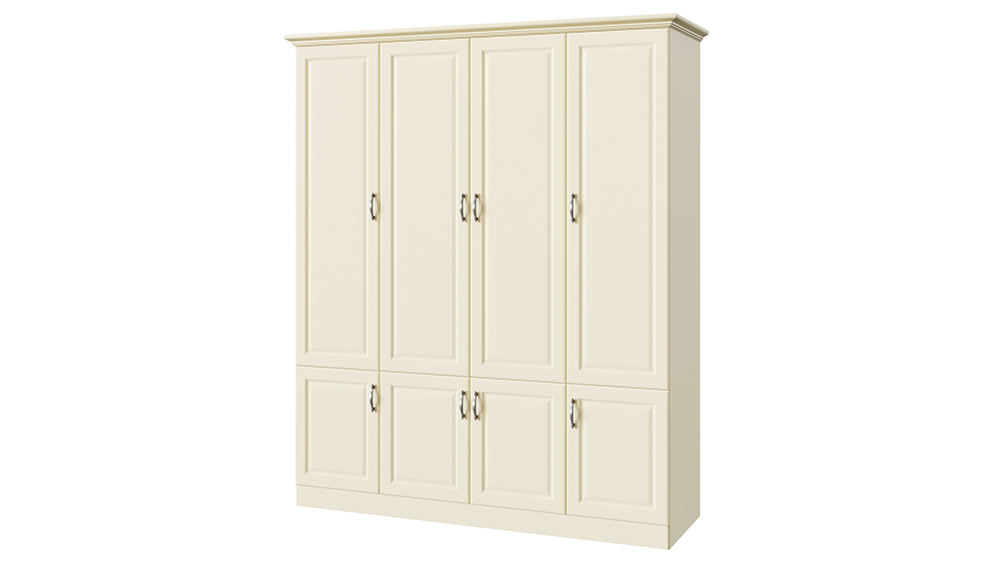 Классический шкаф, созданный в едином стиле с коллекцией Эдем — изделие без которого не возможно себе представить спальню. Корпус шкафа может быть изготовлен как из массива бука и ясеня, так и из массива мягколиственных пород, что делает его стоимость еще более демократичной. Четырех створчатый шкаф имеет 3 базовые комплектации: c антресольной секцией в верхней (4-3) или нижней части (4-1) шкафа или двумя выкатными ящиками (4-2) в нижней части шкафа. В стандартном оснащении двух створчатая секция шкафа располагается по центру шкафа и имеет два выкатных ящика. Фасады шкафа могут иметь встроенные зеркала, как на лицевой части фасада — по размеру филенчатой части, так и на внутренней стороне фасада. Распашные дверцы шкафа оснащены петлями с системой до-закрытия в базовой комплектации. В широкой центральной секции шкафа предусмотрена штанга для плечиков, а в малых секциях предусмотрены полки для хранения вещей. По желанию шкаф может быть оснащен любым количеством полок.
