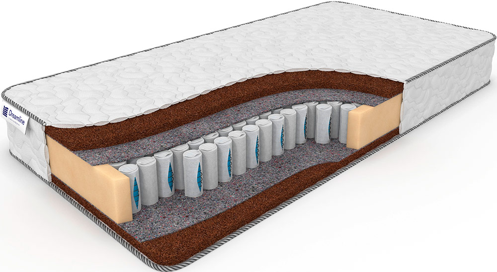 Матрас Dream 3 DS - индивидуально спроектированная модель, с заменой пружинного блока на DS (Double Spring, двойные пружины / пружина в пружине, расположенные в шахматном порядке ~ 570 пружин на одно спальное место). Главными преимуществами, в сравнении с оригинальной моделью и применяемым двойным столбом пружин, являются улучшенные: поддерживающие свойста для большого веса, уровень комфорта во время сна для спящих с большой разницей в весе, анатомические свойства и максимально допустимая нагрузка на одно спальное место. Товар является нестандартным изделием с сохранением гарантийных обязательств от фабрики Dreamline. Среди матрасов с пружинным блоком от фабрики Dreamline этот занимает лидирующие позиции по уровню упругости и жёсткости. Благодаря DS – конструкция легко выдерживает нагрузку до 150 кг на одно спальное место. Жёсткость натуральной койры гарантирует комфортное расположение тела в горизонтальной плоскости. Срок службы матраса измеряется годами, благодаря прослойке из льноджутового волокна, которая препятствует пагубным контактам койры и металла пружин.