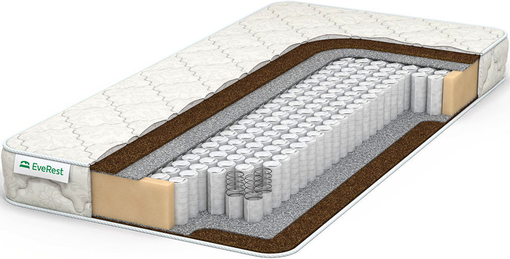 Пружинный жесткий матрас с ортопедическим эффектом и одним видом наполнителя — бикокосом. Популярный блок TFK обеспечивает ортопедические свойства матраса. В его основе лежат самые прочные пружины, с сечением стальной проволоки 2 мм. Плотность их размещения — 250 пр./кв.м. Жесткость матрасу с двух сторон придают плиты бикокоса 1 см толщиной. Настил равномерно распределяет нагрузку по поверхности. В этом материале соединены волокна околоплодника кокоса с холлофайбером. Между наполнителем и пружинным блоком проложен войлок, защищающий настилы от истирания. Чехол из хлопкового жаккарда.