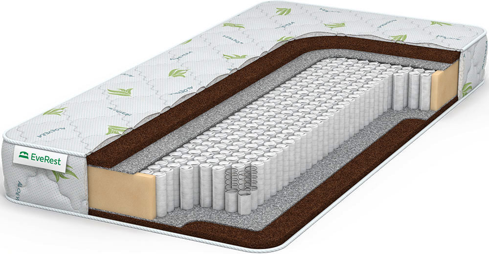 Жесткий пружинный матрас с ортопедическим эффектом и одним видом наполнителя — кокосовай койра. Основа модели — блок MultiPocket из адаптивных микропружин (500 пр./кв.м), в пружине 8 витков, толщина сечения проволоки — 1,3 мм. Анатомические свойства матраса связаны со способностью пружин точечно реагировать на нагрузку, повторять изгибы тела. Жесткость матрасу с двух сторон придают кокосовые плиты 2 см толщиной. Это натуральный наполнитель, пропитанный латексом для скрепления волокон кокоса и повышения пластичности настила. Между наполнителем и пружинным блоком проложен войлок, защищающий койру от истирания. Трикотажный чехол защищен от бактерий составом Aloe Vera.