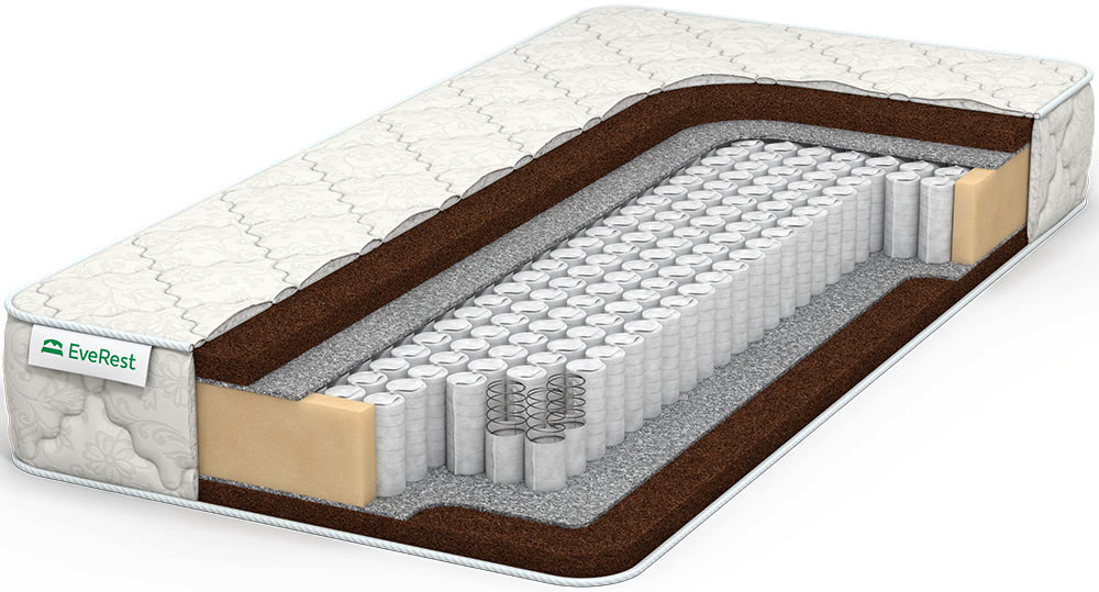 Жесткость и ортопедические свойства модели придают кокосовые настилы 3 см толщиной. Это натуральный наполнитель, пропитанный латексом для скрепления волокон кокоса и повышения его пластичности. От пружин койра защищена войлоком.