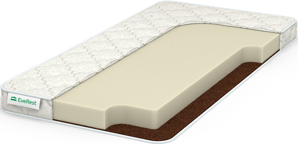 Беспружинный матрас включает наполнители двух видов: природную койру и пенополиуретан. Модель разносторонней жесткости высотой 11 см. Пласт пенополиуретана толщиной 10 см лежит в основе матраса. Он изготовлен из высокоэластичного полиэфира по технологии вспенивания. Благодаря своей структуре обладает упругостью и воздухопроницаемостью. Обеспечивает умеренную жесткость одной из спальных поверхностей. Плита койры кокоса, для повышения эластичности пропитанная латексом, придает жесткость второму спальному месту. Матрас не вызывает аллергии, поглощает вибрацию и обеспечивает комфортный сон. Подходит для выравнивания спальной поверхности на диване. Чехол выполнен из смесового жаккарда.