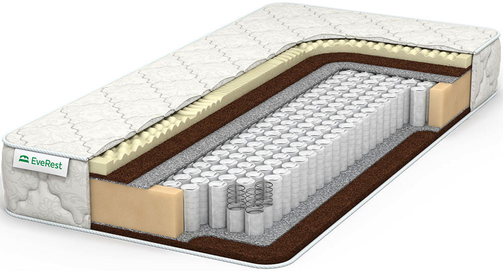 Анатомический пружинный матрас с двумя видами наполнителя: койры и латекса, обеспечивающих разностороннюю жесткость спальных поверхностей.