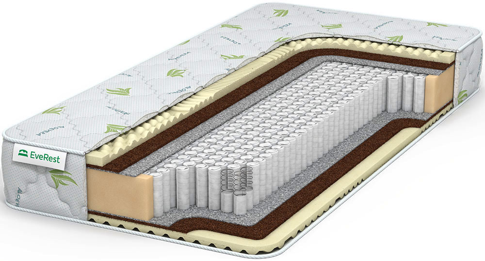 Пружинный матрас с ортопедическими и массажными свойствами средней жесткости. В качестве наполнителя в нем использован семизональный латекс и койра. В основе модели лежит блок S1000 из микропружин (500 пр./кв.м). Каждая из них упакована в индивидуальные чехлы. Умеренную жесткость матрасу придает койра, изолированная от пружинного блока войлоком. Мягкость и легкий массажный эффект с двух сторон спальному месту обеспечивает перфорированный природный латекс с рельефом. Чехол матраса изготовлен из хлопкового прочного трикотажа с антисептической пропиткой AloeVera.