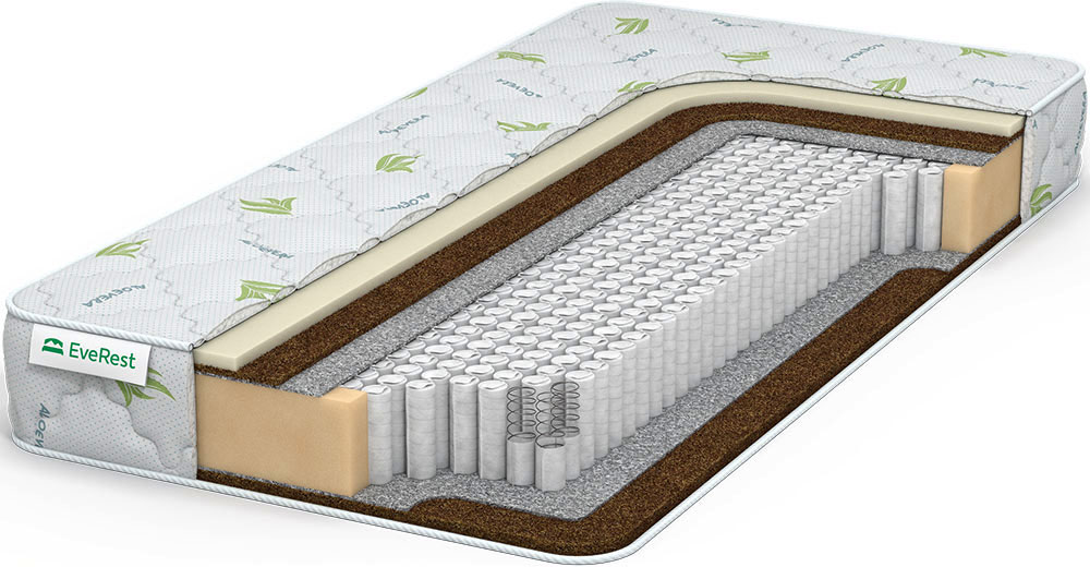 Пружинный матрас и двумя видами наполнителя: искусственным латексом и бикокосом. Модель разносторонней жесткости, обладающая ортопедическим эффектом. Основа модели — блок MultiPocket из адаптивных микропружин (500 пр./кв.м), обеспечивает ортопедические качества модели. Умеренно-жесткая спальная сторона включает два наполнителя: искусственный латекс толщиной 2 см и такой же толщины бикокос. В бикокосе соединены волокна околоплодника кокоса с холлофайбером. Искусственный латекс — это плотный и долговечный пенополиуретан. Вторая сторона жесткая за счет настила из бикокоса толщиной 2 см. Трикотажный чехол защищен от бактерий составом Aloe Vera.