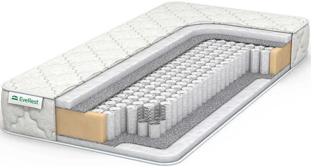 Пружинный матрас с ортопедическими свойствами средней жесткости с наполнителем из холофайбера. Ортопедические свойства матраса обеспечены популярным блоком TFK. В его основе лежат самые прочные пружины, с сечением стальной проволоки 2 мм. Плотность их размещения — 250 пр./кв.м. На спальных поверхностях уложен настил из холофайбера 3 см толщиной. Это нетканый материал из вертикальных волокон полиэстера, закрученных подобно пружинам, что обеспечивает материалу упругость. От истирания пружинами он защищен войлоком. Чехол матраса изготовлен из жаккарда, имеющего сложное плетение из 24 нитей.