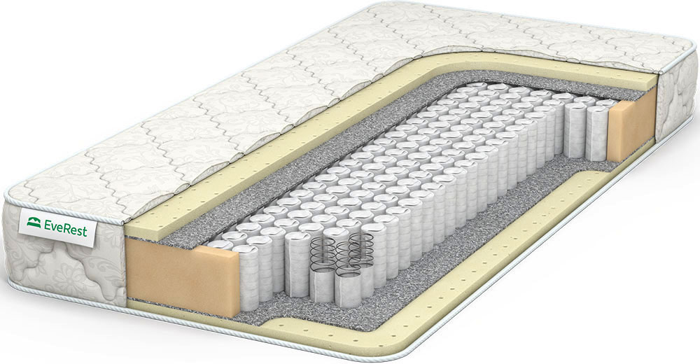 В основе лежит блок из небольших пружин TFK (250 пр./кв.м) с толщиной проволоки 1,8 мм. За счет большого количества пружин матрас точно повторяет изгибы тела.