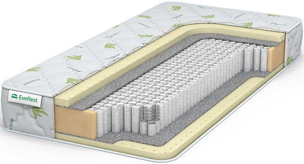 Умеренно-мягкий пружинный матрас включает натуральный наполнитель — латекс, изолированный войлоком от пружин. Относится к ортопедическим моделям. В основе лежит блок из микропружин MultiPocket (500 пр./кв.м), упакованных в индивидуальные чехлы. Толщина проволоки — 1,3 мм. За счет большого количества пружин матрас повторяет изгибы тела, точечно реагирует на нагрузку и выдерживает большие нагрузки. Настилы природного латекса толщиной 3 см с двух спальных сторон придают модели мягкость. Сквозная перфорация обеспечивает свободный воздухообмен. Чехол из трикотажа пропитан специальным составом Aloe Vera — экстрактом с антисептическими свойствами, и простеган на холконе.